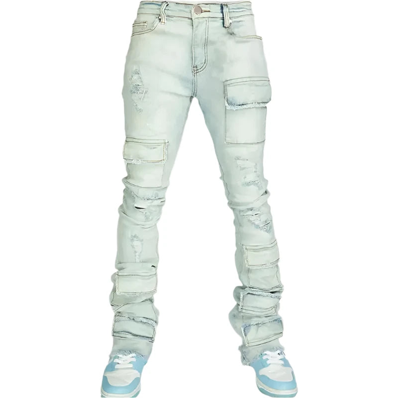 Y2K Men’s Streetwear Jeans - Vintage Ripped Patchwork Cargo Pants with Pockets, Slim Fit Pleated Solid Denim for Spring & Fall