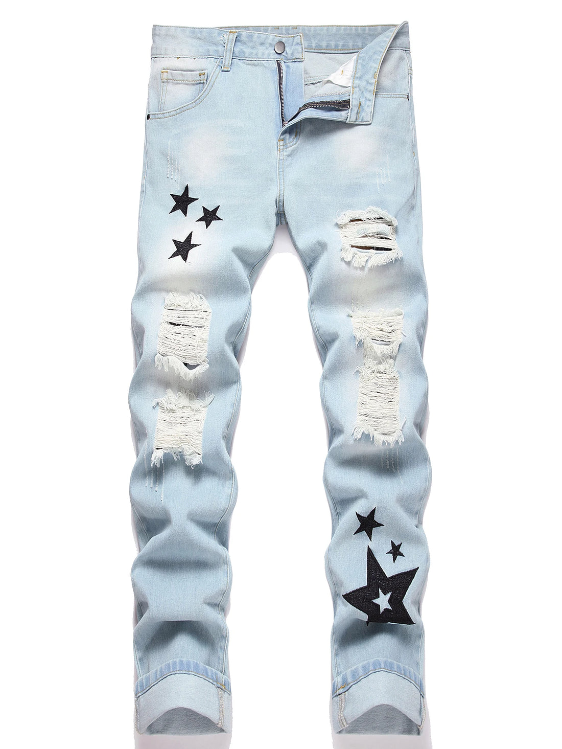 Y2K Men’s Blue Distressed Jeans – Low Rise Straight Leg Denim Pants with Embroidered Star | Hip Hop Streetwear Fashion