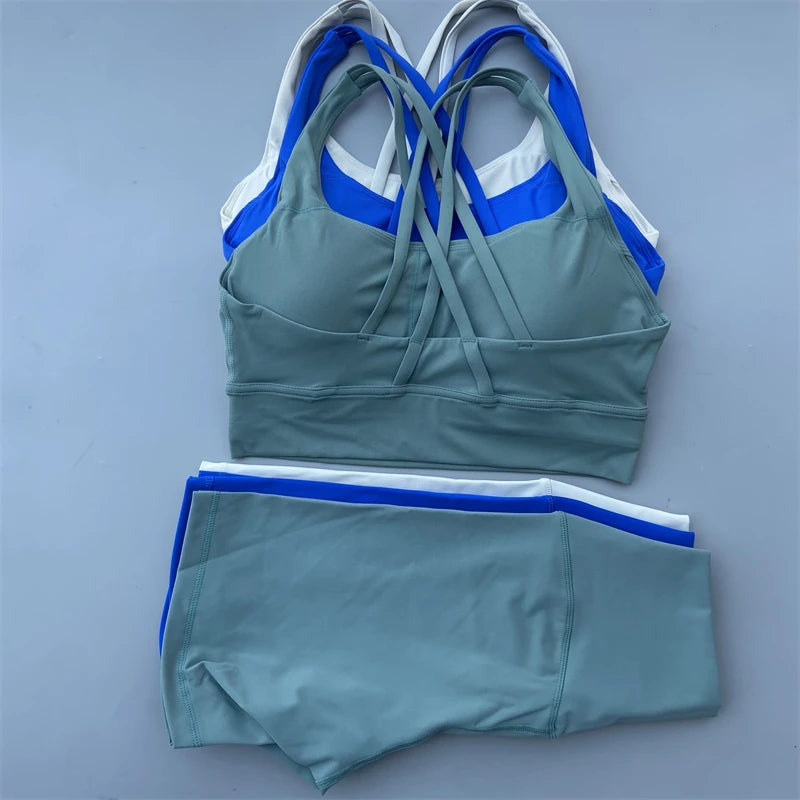 2 Piece Yoga Set Gym Sports Shorts Set Women Workout Outfit Fitness Suit Cross Straps Bra High Waist Shorts Running Tracksuit