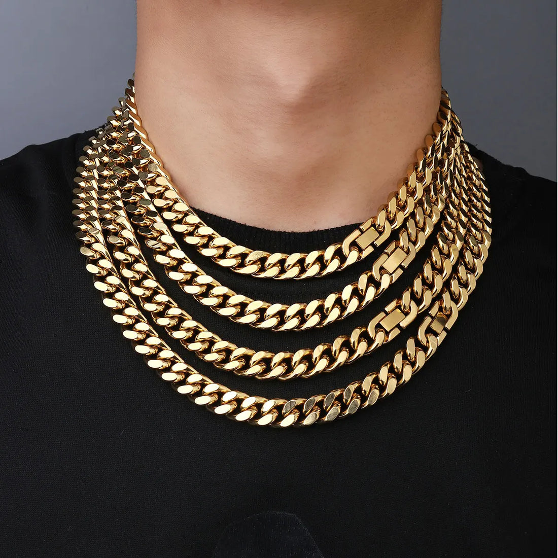 18K Gold Plated Chunky Miami Flat Curb Cuban Link Chain Necklace - High Polished Stainless Steel for Men