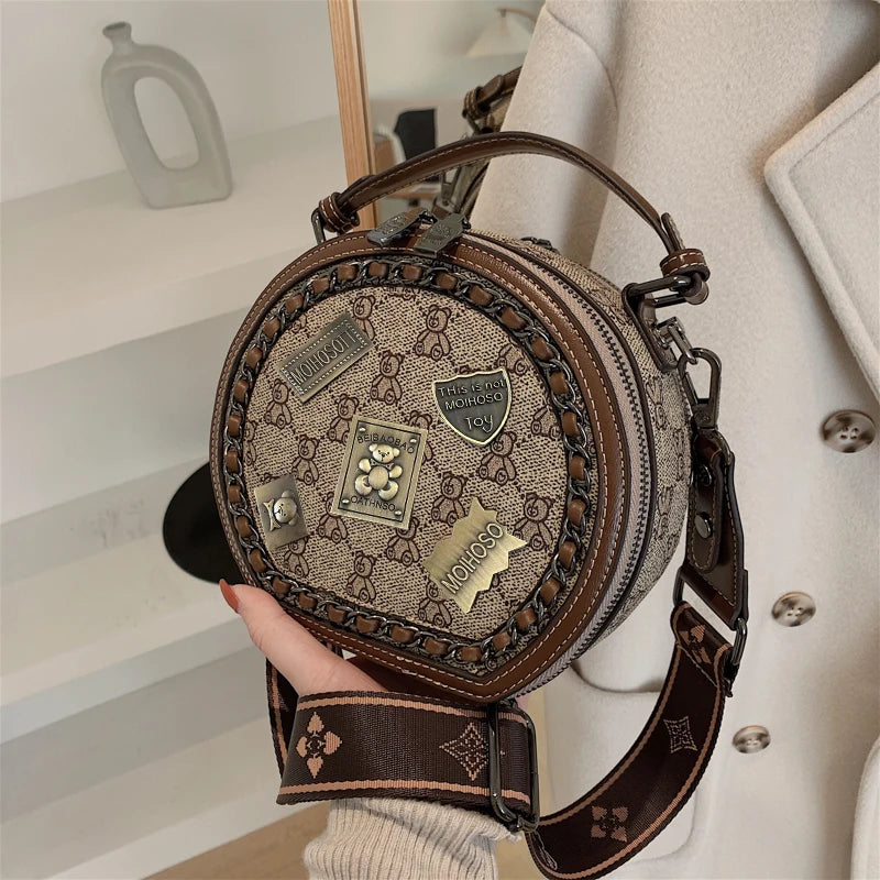 Badge Bear Pattern Round Bag: Casual Fashion Crossbody