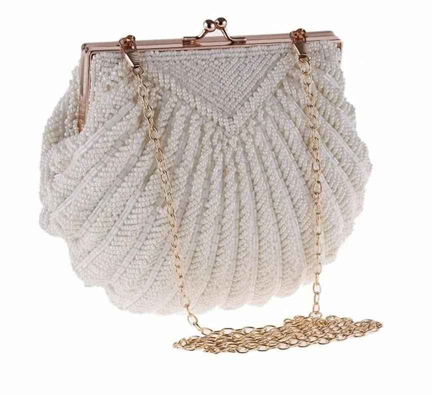 Women's Clutch Bag: Elegant evening clutch bags for weddings. Featuring a bridal handbag adorned with pearl beads.