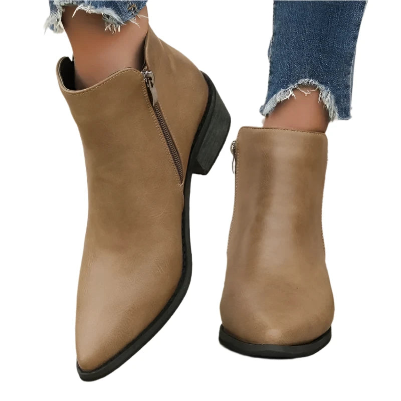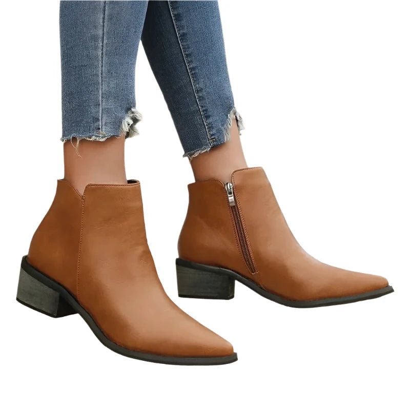 Step into timeless style with these retro-inspired ankle boots, crafted from premium genuine leather. Featuring a chic pointed toe and Western Chelsea boot design, these boots are perfect for adding an elegant touch to your fall and winter wardrobe. The durable rubber outsole ensures comfort and stability, while the plush lining keeps your feet warm. A sleek zipper closure adds convenience and a modern touch to these classic boots.