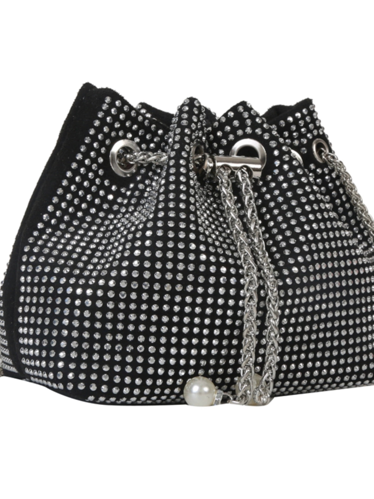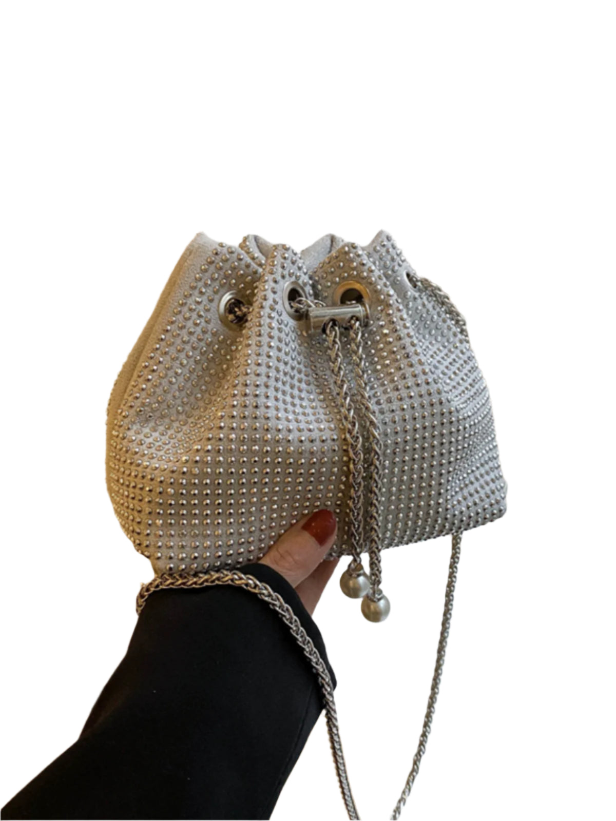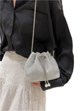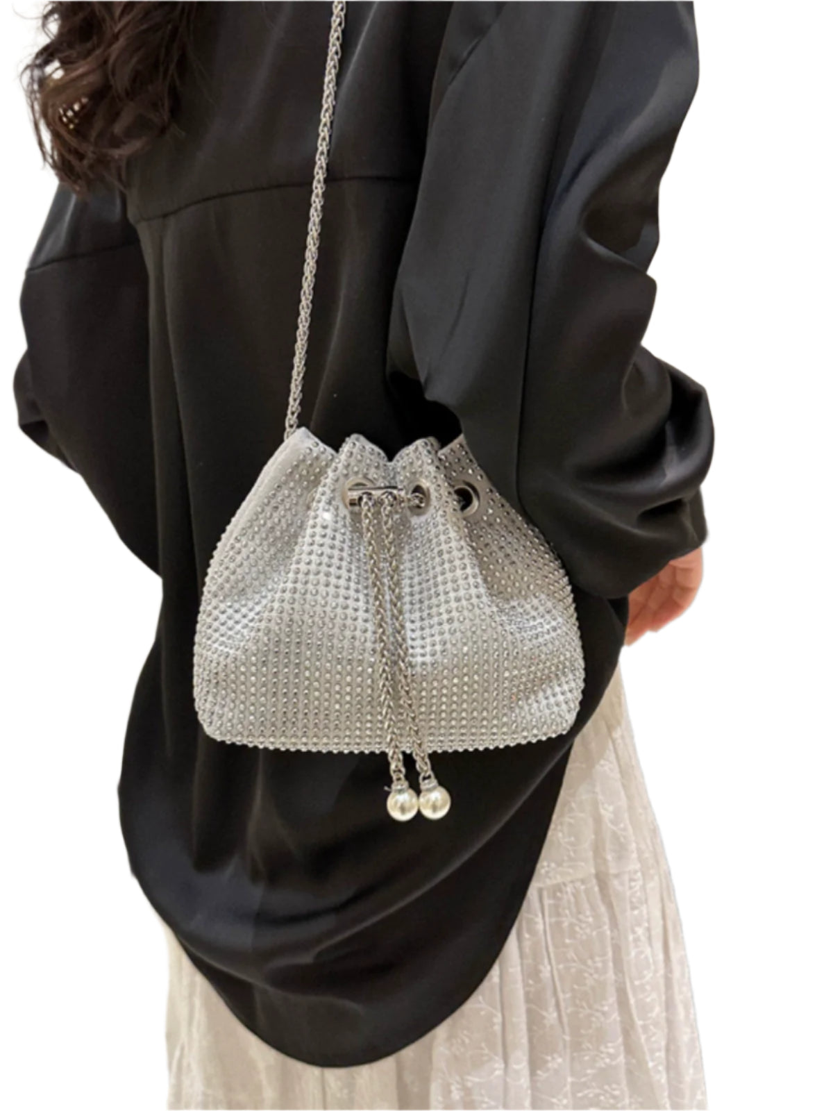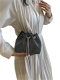 Women's K-Style Trend Rhinestone Bucket Bag - Full Diamond Chain Shoulder Crossbody with Drawstring