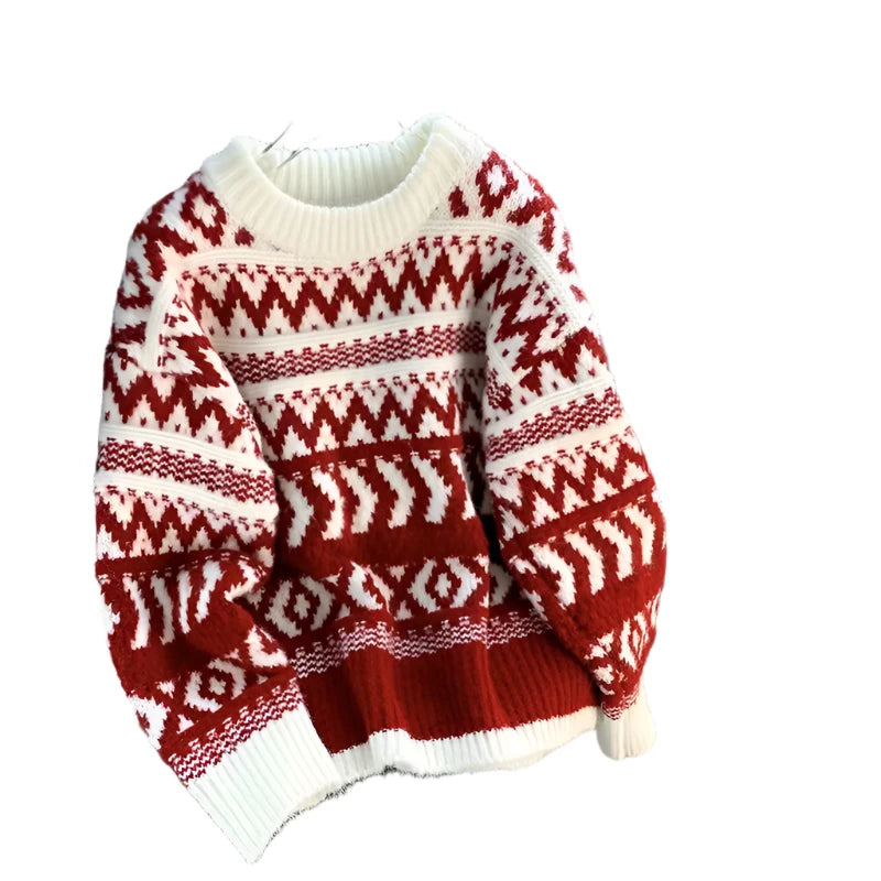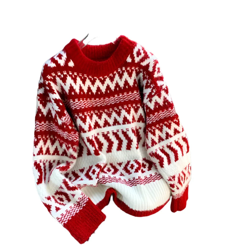 Women's Red Christmas Sweater - Thickened Retro Loose Fit Outerwear, Stylish and Cozy for Autumn Winter