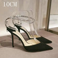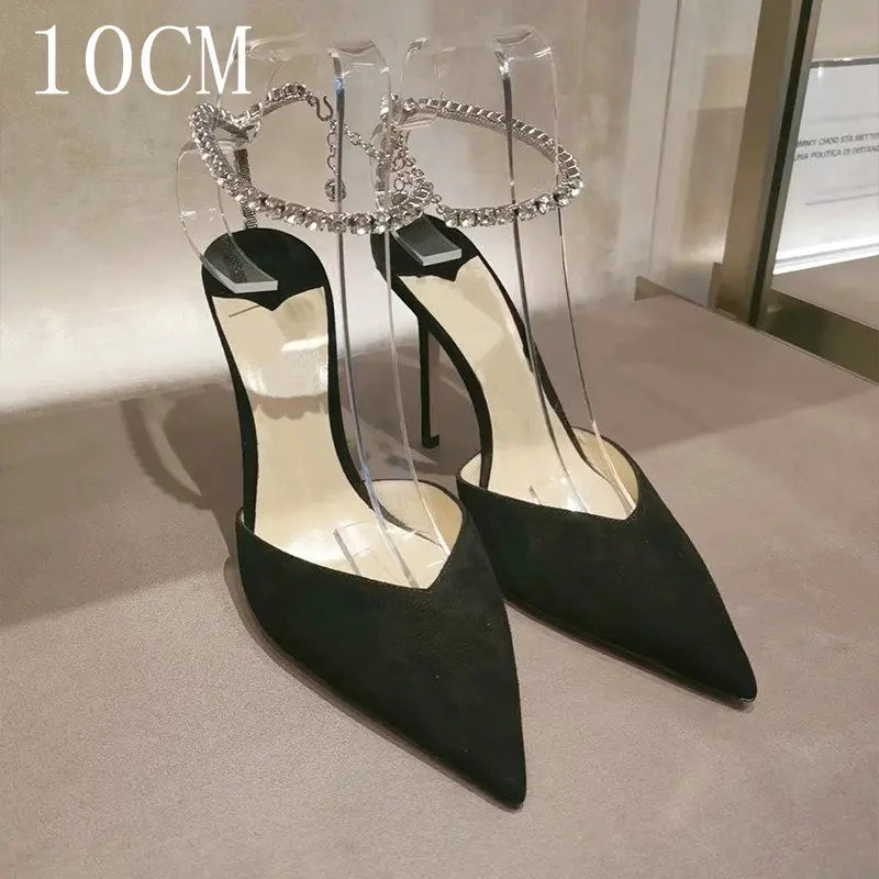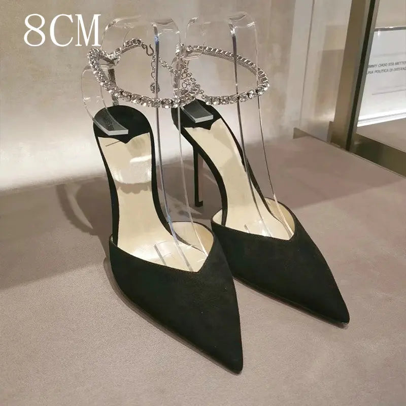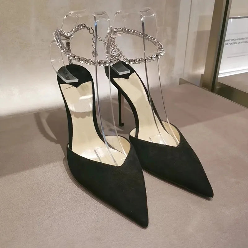 Step into elegance with these luxurious satin high heels, designed for sophistication and style. Featuring a sparkling crystal pendant and rhinestone chain, these pointed-toe stiletto pumps are perfect for weddings, parties, and special occasions.