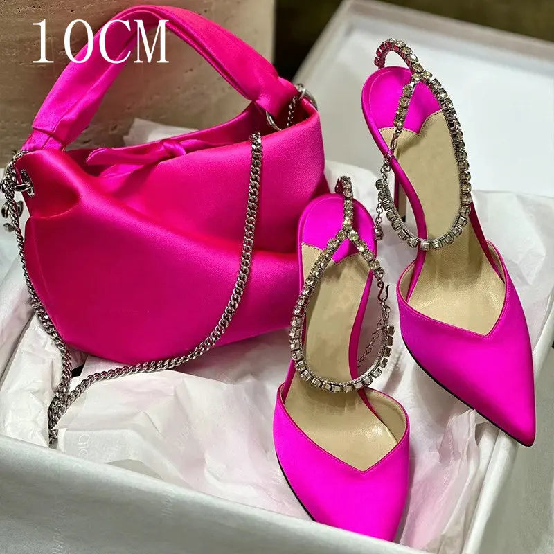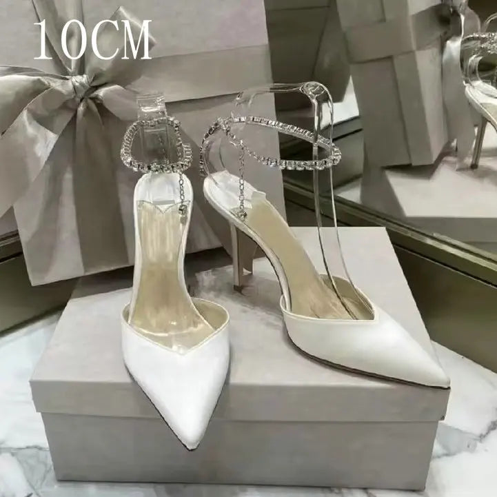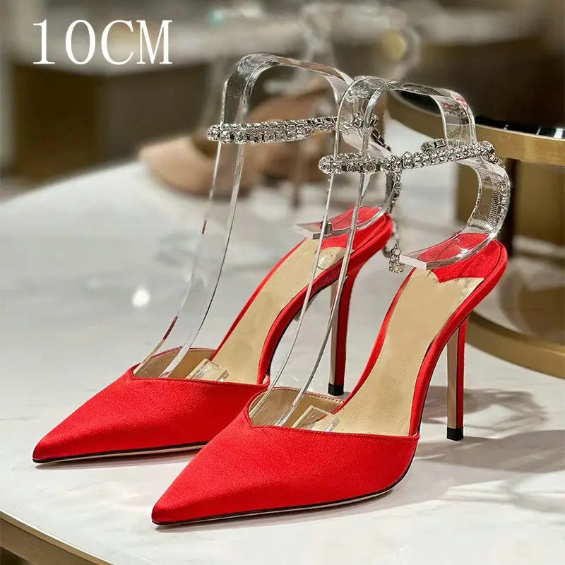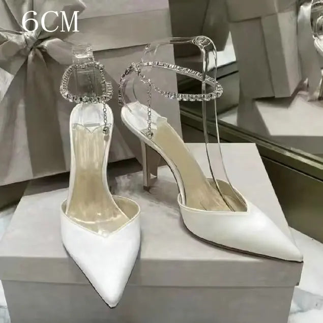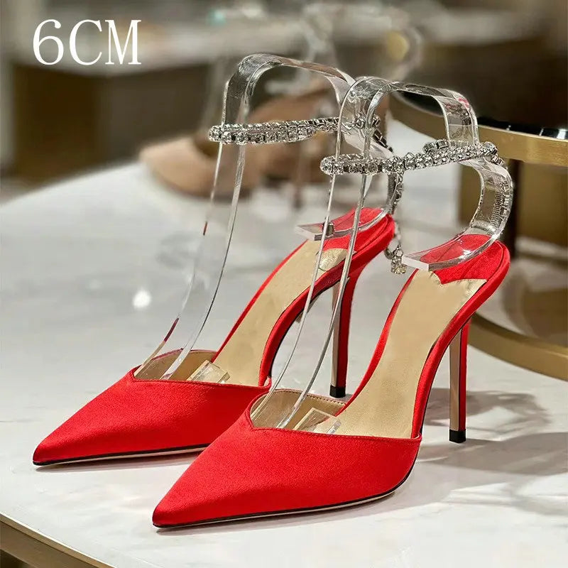 2025 New Satin High Heels – Crystal Pendant, Rhinestone Chain, Pointed-Toe Stiletto Pumps for Weddings & Parties