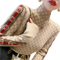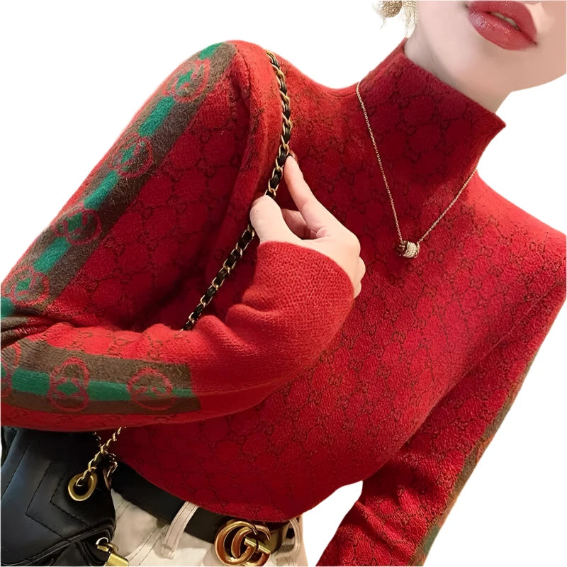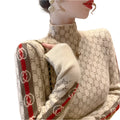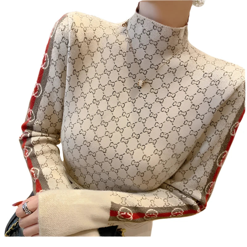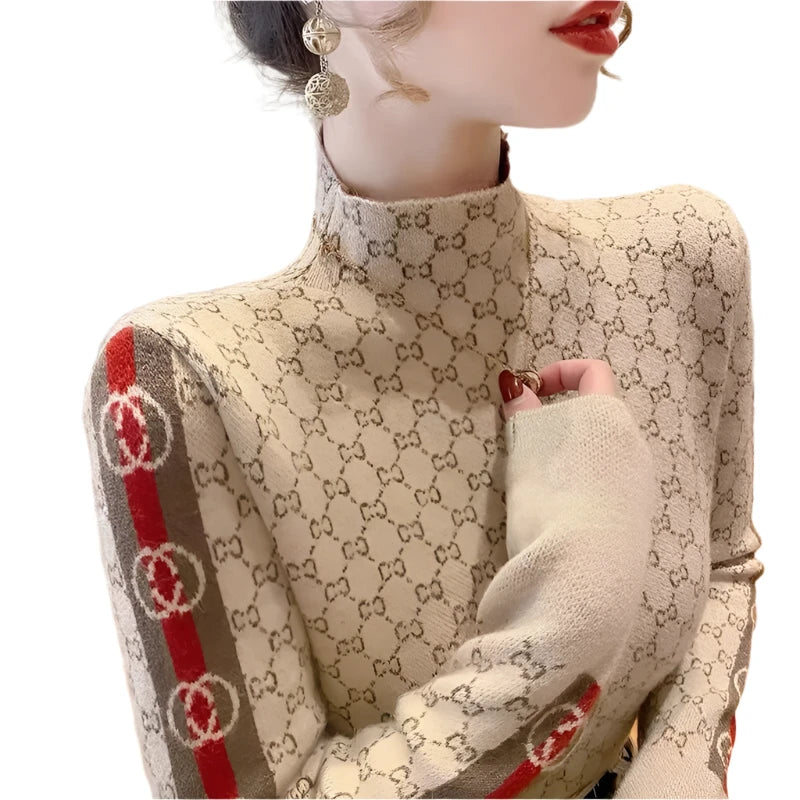 Women's Chic Letter Jacquard Sweater - Half High Collar Slim Fit Wool Knitwear Pullover for Autumn & Winter Fashion