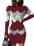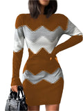 Autumn Winter Women’s Fashion Print Slim Bodycon Mini Dress, Long-Sleeve O-Neck Elegant Package Hips Vestidos