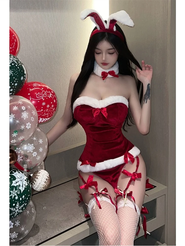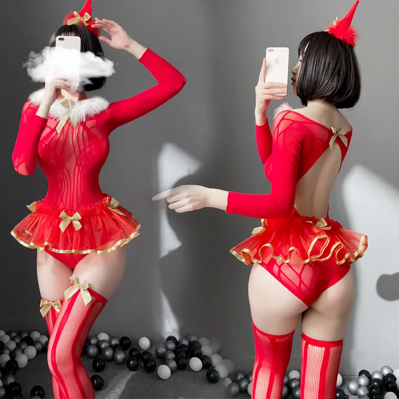 Get festive and flirty with this Christmas Women's Sexy Crotchless Lingerie Set, featuring a seductive Lace Hollow Deep V Bra and an alluring Open Back Design. This erotic New Year costume is perfect for adding spice to your celebrations.