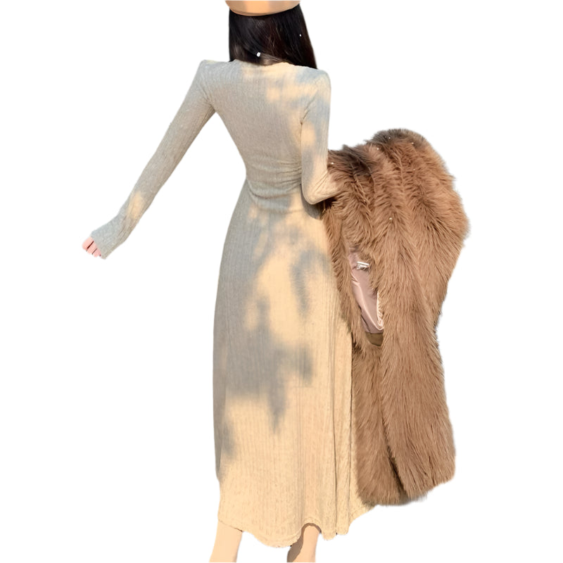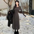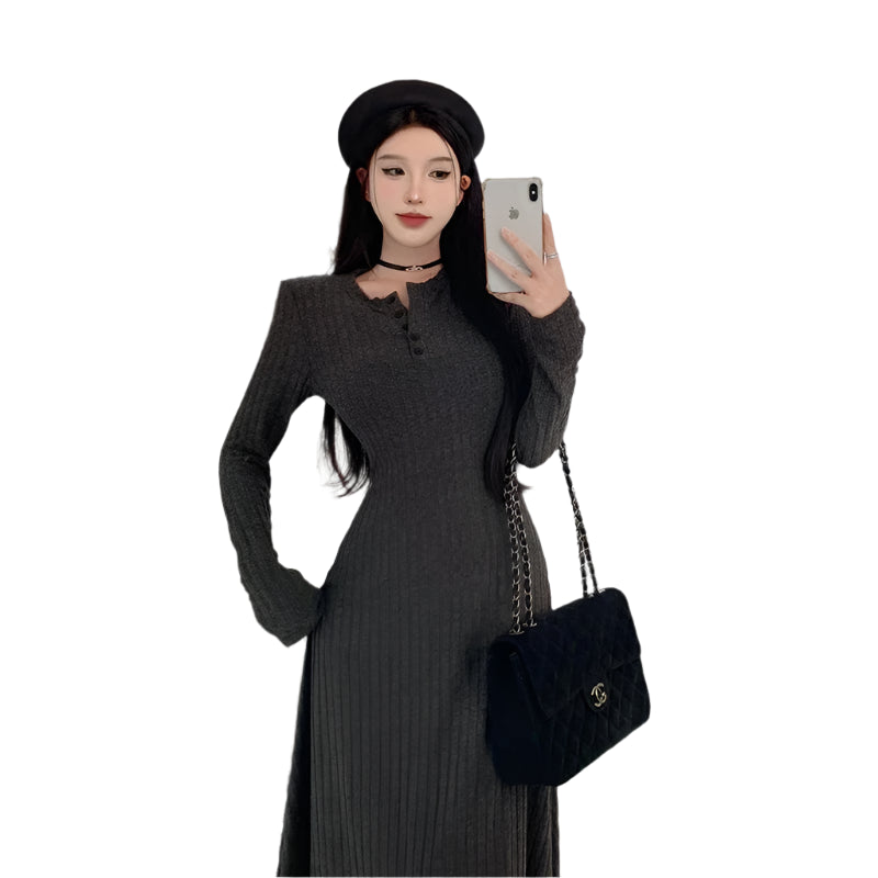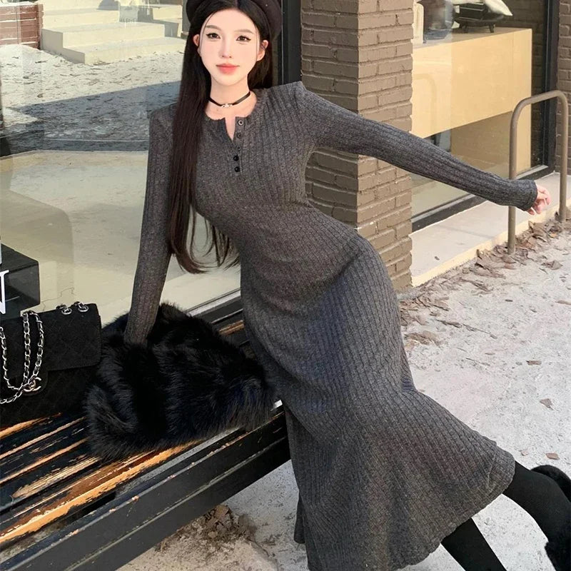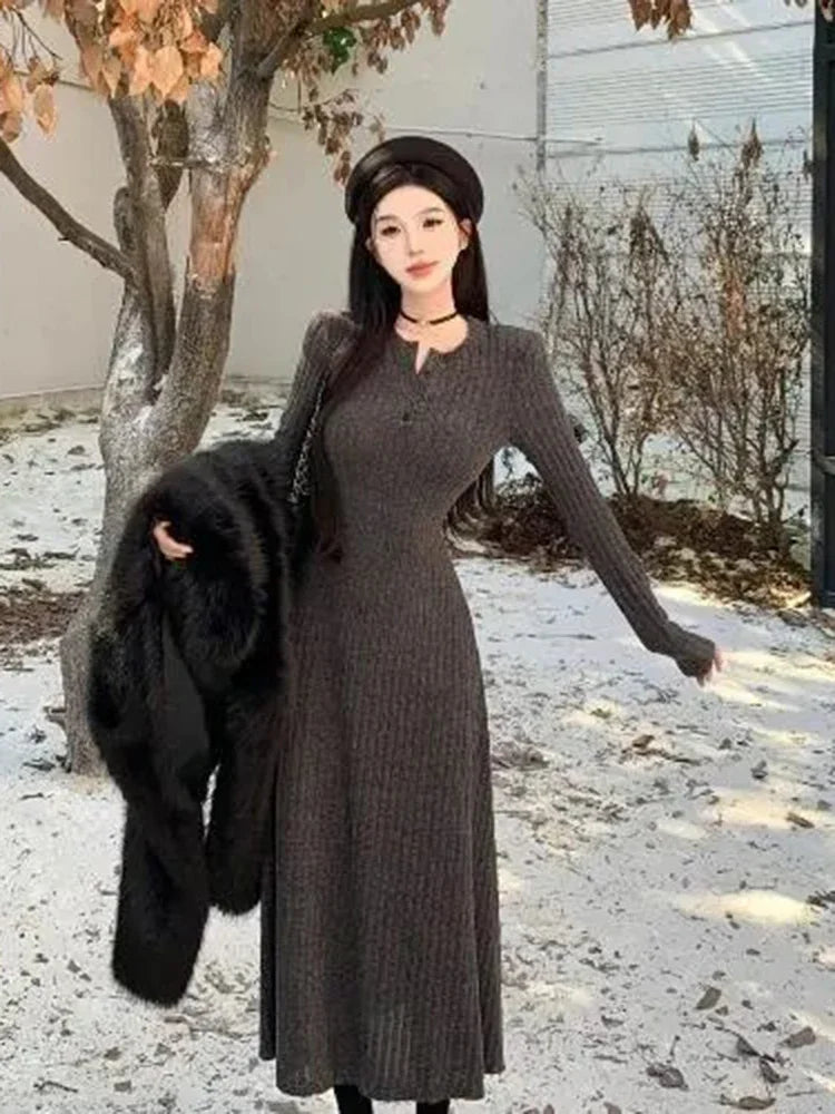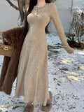 Fall/Autumn & Winter Elegant Long Sleeve Knit Midi Dress for Women – Slim Solid Basic Defined Waist Vestidos