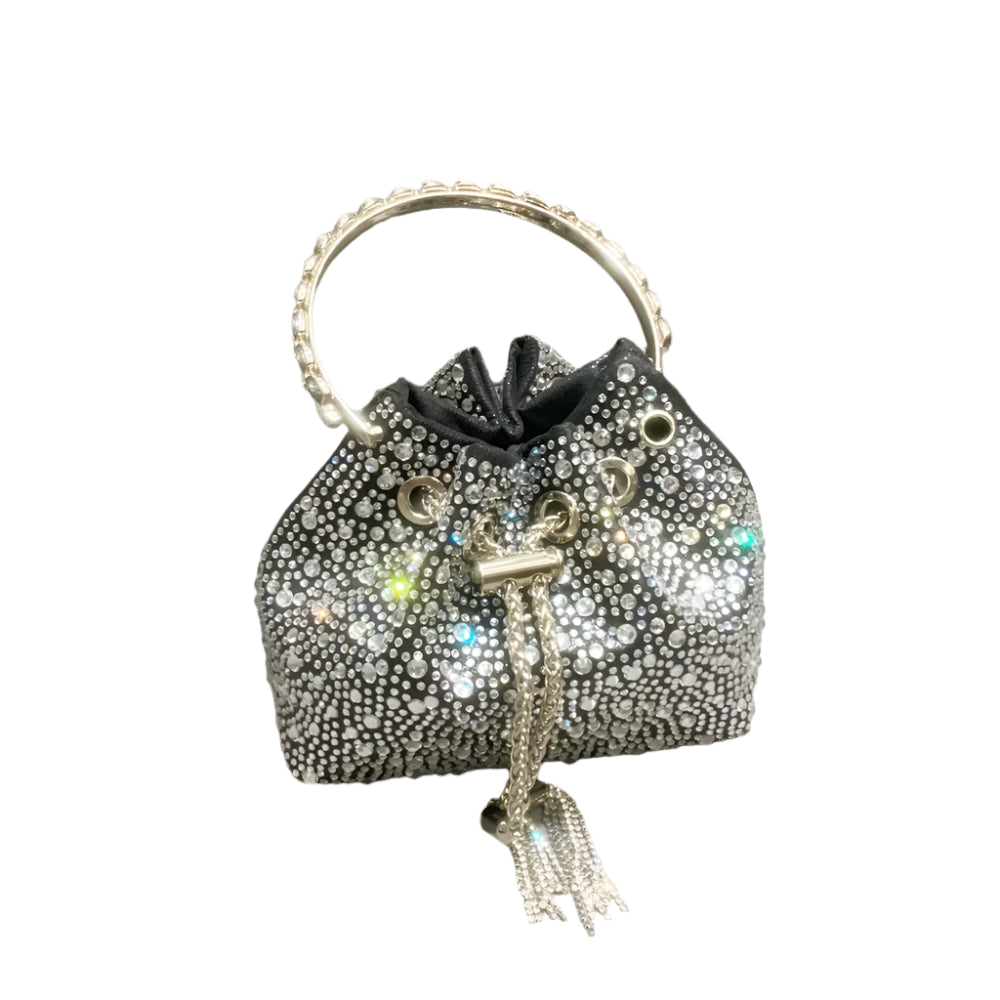 Design: The bucket shape adds a modern twist to a classic design, adorned with sparkling rhinestones and a chic tassel for added flair.