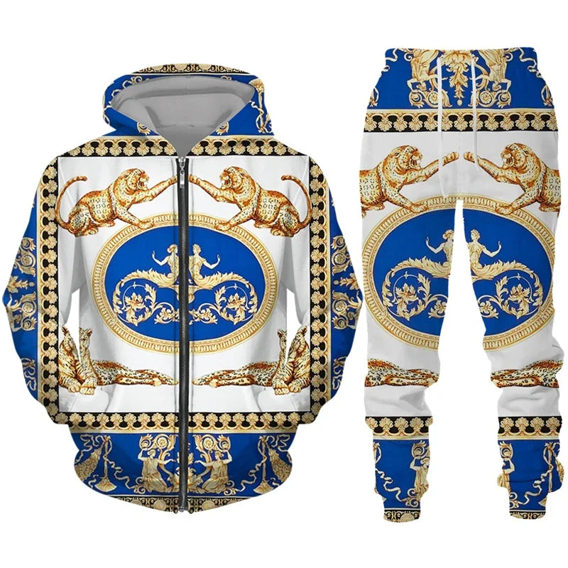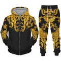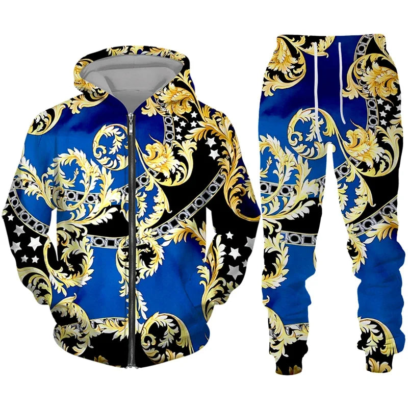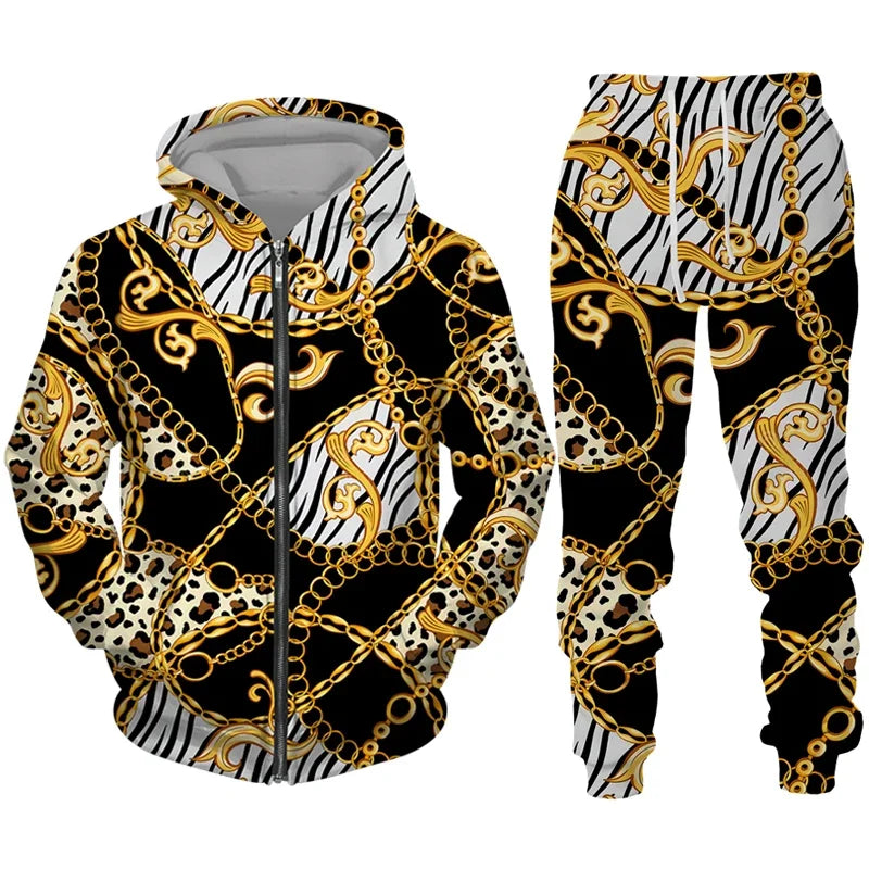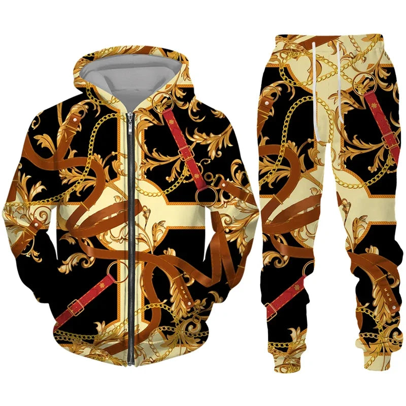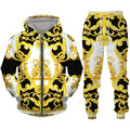 Men’s Luxury 3D Gold Pattern Tracksuit Set – Zip Hoodie & Pants, Oversized Casual Fashion