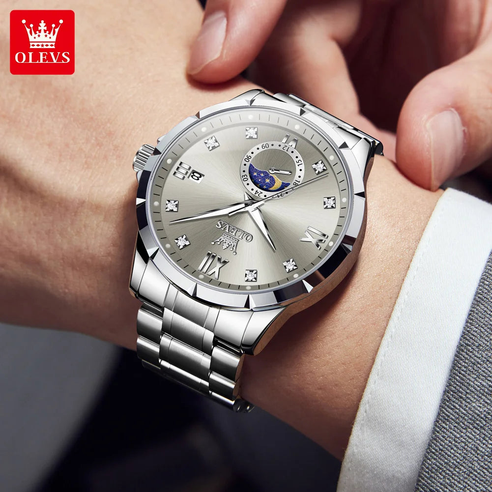 Men’s Luxury Business Quartz Watch is the ultimate fusion of style and precision. Crafted from durable stainless steel, it features a luminous dial, complete calendar, and moon phase display that sets it apart as a true gentleman’s timepiece. With waterproof performance and a sleek design, this watch is perfect for business, fashion, and everyday wear—making it more than a watch, but a statement of success.