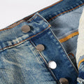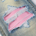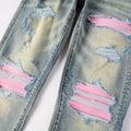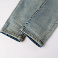 Men’s Stretch Slim Fit Ripped Jeans – Retro Washed Denim with Patchwork Leather & Red Accents
