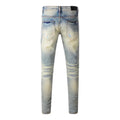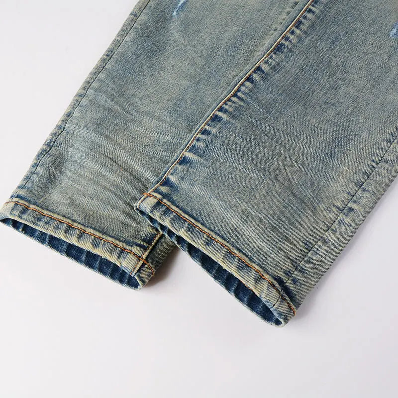 Men’s Stretch Slim Fit Ripped Jeans. Designed with a bold retro washed finish, edgy ripped holes, and eye-catching patchwork leather with red accents. Inspired by nostalgic high-street fashion, these jeans combine comfort, flexibility, and statement style—perfect for modern casual wear all year round.