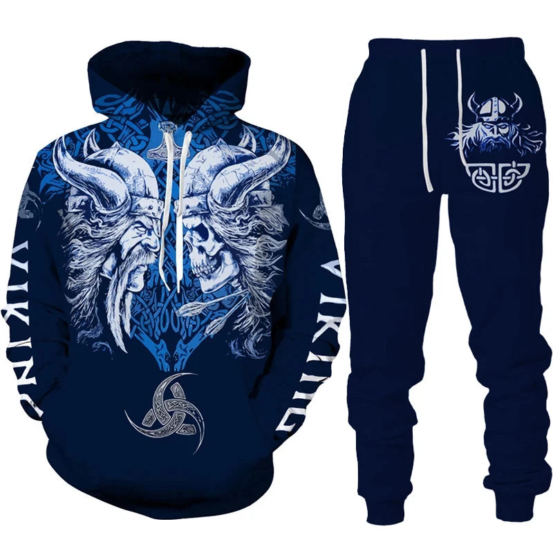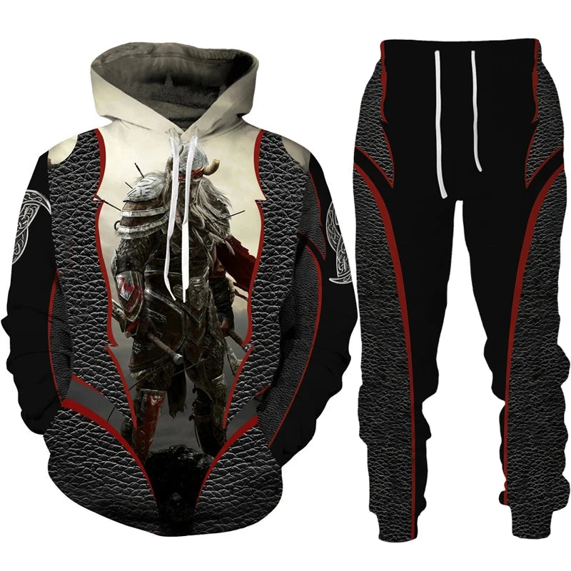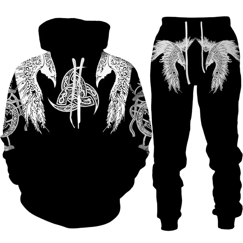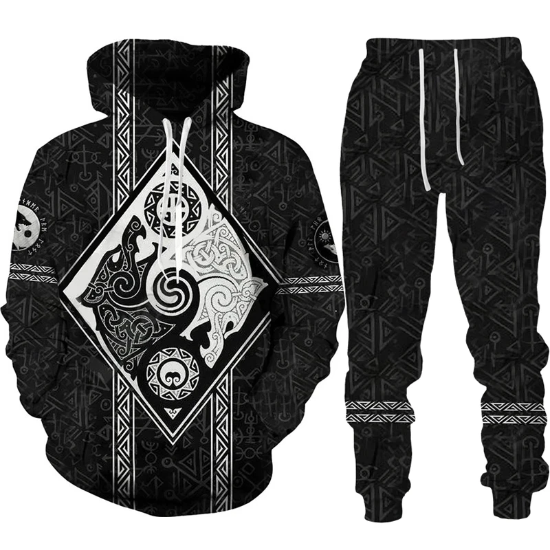 Men’s Vintage 3D Viking Tracksuit Set – Hoodie & Pants, Unisex Casual Sportswear