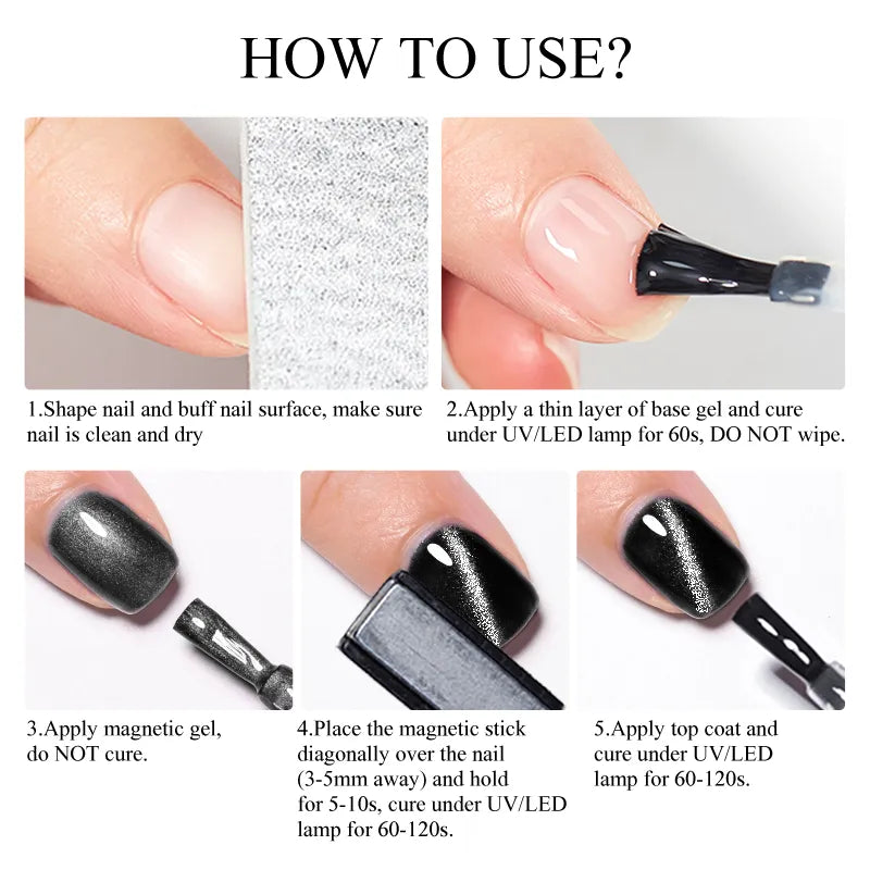 Professional Usage: Step 1: Clean Nails then polish the nail surface as normal manicure process. Step 2: Fully shake up the gel polish, it can make the gel polish color balanced. (Important) Step 3: Apply Base gel first, which can make polish last longer, cure with UV lamp or LED lamp. (Necessary) Step 4: You can apply color gel as a base to get a better effect. Step 5: Apply the first layer of Super Shine Cat Magnetic Gel, and use a magnetic stick to push the shape you want, then cure it. Step 6: Apply the second layer of Super Shine Cat Magnetic Gel and use a magnetic stick to push the shape again, then cure for 30-60s. Step 7: Coat with top coat, cured by UV lamp or LED lamp.