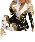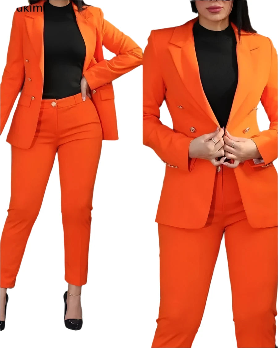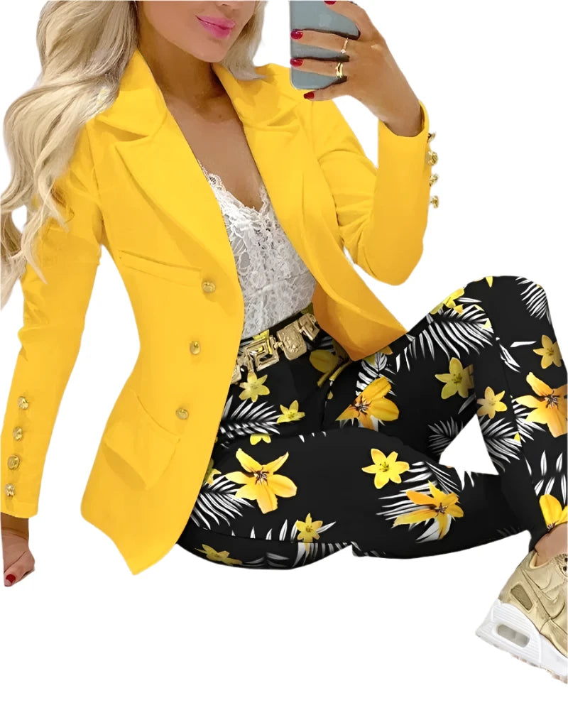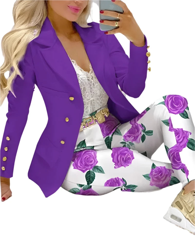 - Design: Turn-down lapel collar blazer with single-breasted closure and matching high-waist pencil pants.