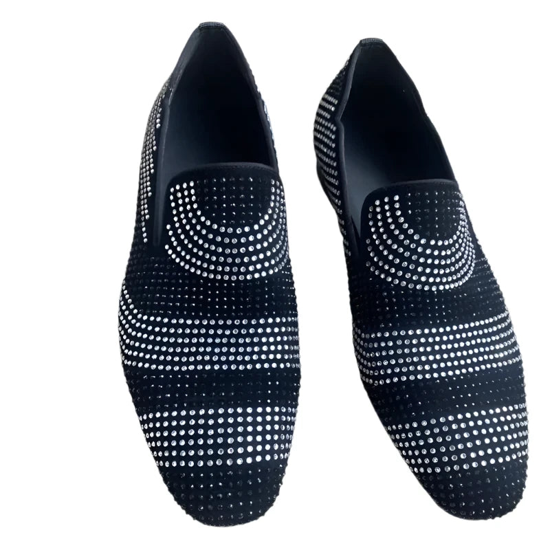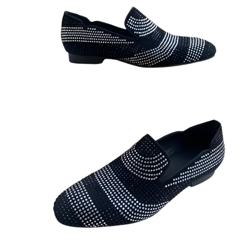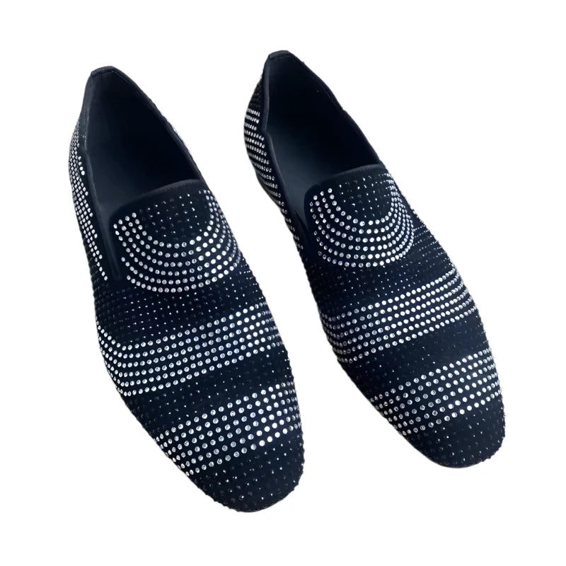 New Black & White Rhinestone Loafers for Men – Suede Leather Italian Dress Shoes with Crystal Accents, Slip-On Flats