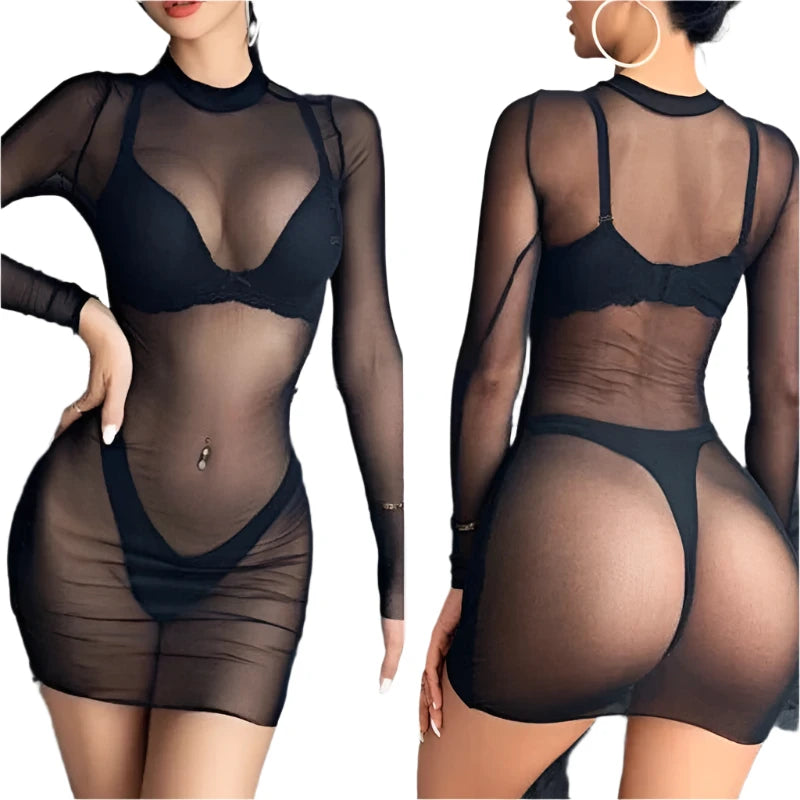 Plus Size Sheer Mesh Lingerie Dress, designed to highlight your curves and add a touch of daring to your nightwear or club outfit. The see-through mesh fabric and long sleeves offer a sultry yet comfortable fit, perfect for both intimate evenings and fun nights out.
