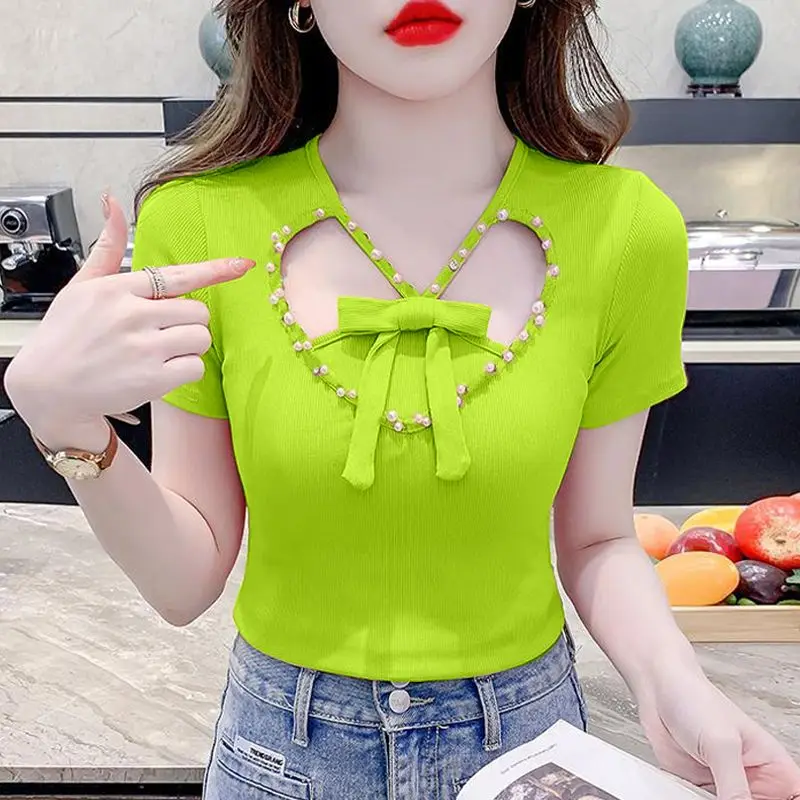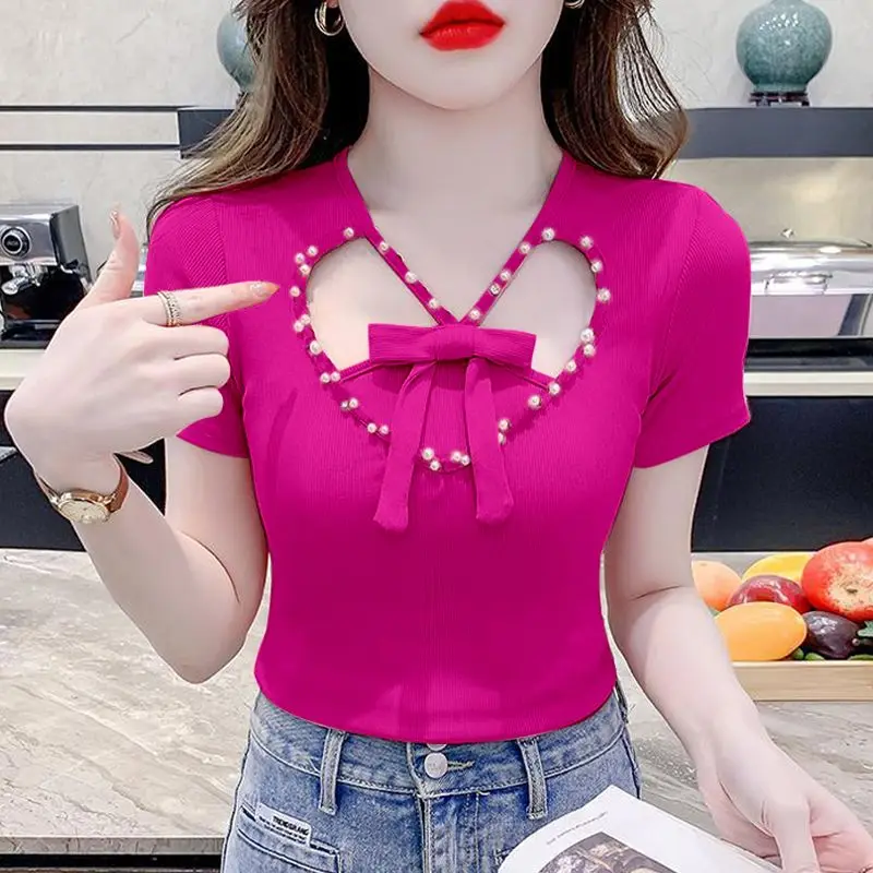 2024 Women's Summer Bow T-Shirt - Short Sleeve with Beaded Design - Unique & Chic Top