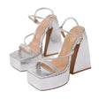 Women's Platform Sandals with Rhinestones – 14CM Square Heel, Lace-up PU Fashion Pumps, Trendy Summer Square Toe Shoes for Women