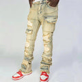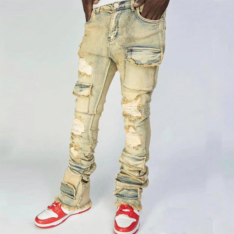Y2K Men’s Streetwear Jeans - Vintage Ripped Patchwork Cargo Pants with Pockets, Slim Fit Pleated Solid Denim for Spring & Fall